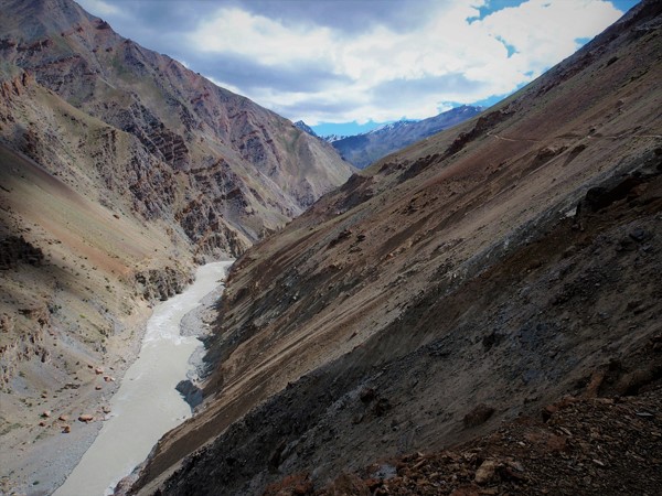 C'est pas tout ça, il me faut maintenant retrouver le fameux pont et cette fois, le franchir avec tout mon barda sur le dos. A première vue, cela semble simple, mais il faut quand même oser y mettre le premier pied et savoir comment avancer sans faire vaciller cette structure qui paraît peu stable !! Il faut savoir que ce pont a été construit à la hâte après la rupture du barrage naturel qui s'était formé en 2015, suite à un glissement de terrain. Cette rupture a provoqué une vague gigantesque qui s'est abattue sur les villages situées le long de la rivière jusqu'à Padum, emportant avec elle les ponts ainsi que des bâtiments. Fort heureusement, cette catastrophe qui s'est produite le 7 mai 2016 ne fit aucune victimes. Au moins ce jour-là ! Car en ce moment précis, j'ai une pensée pour le petit garçon de Rigzing qui était moine au monastère et qui, bien malencontreusement, est tombé de ce pont. Repose en paix, petit ange.
